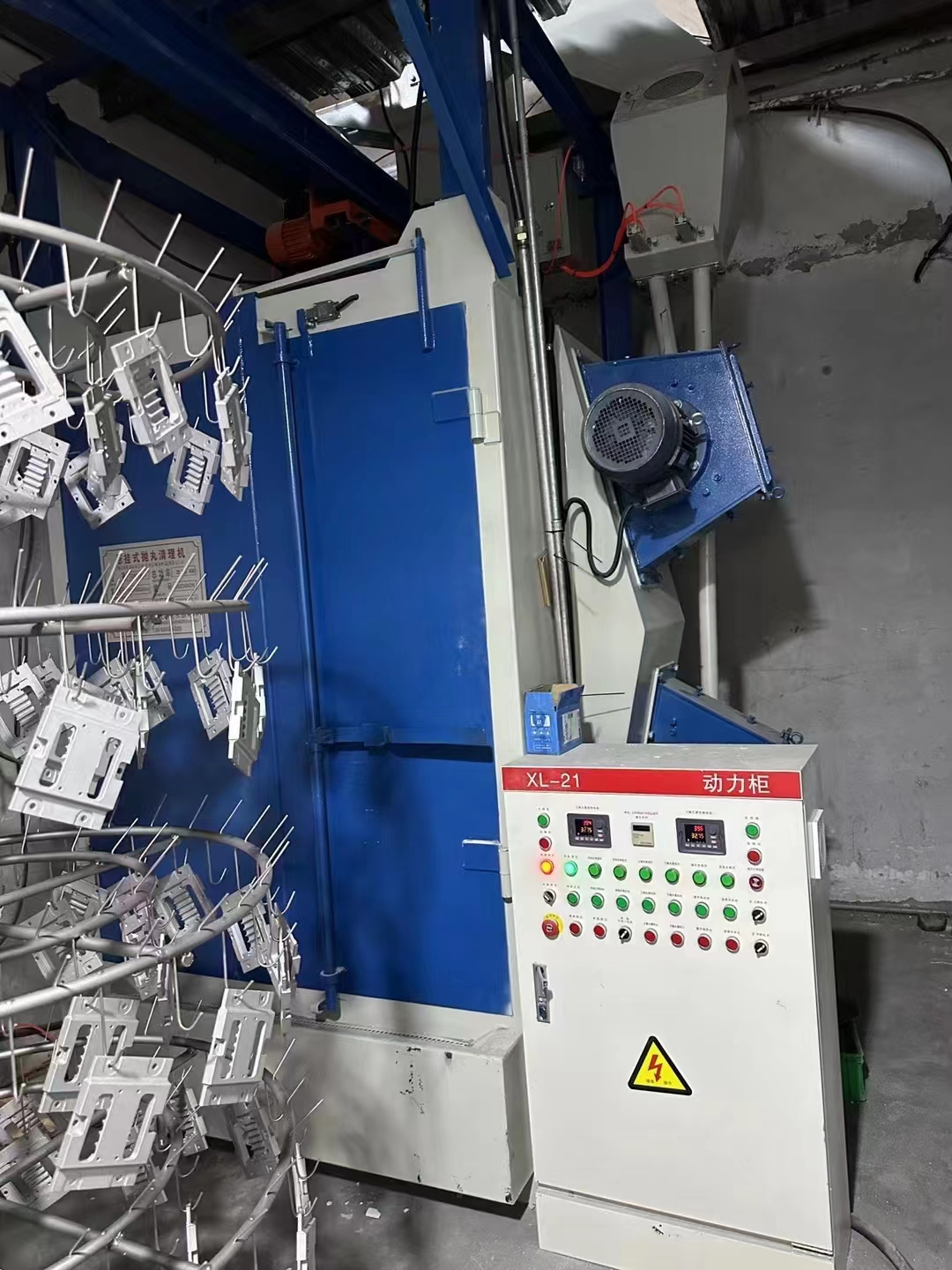 上图是铝制品客户使用我公司悬挂式抛丸清理机,抛丸效果看得见!